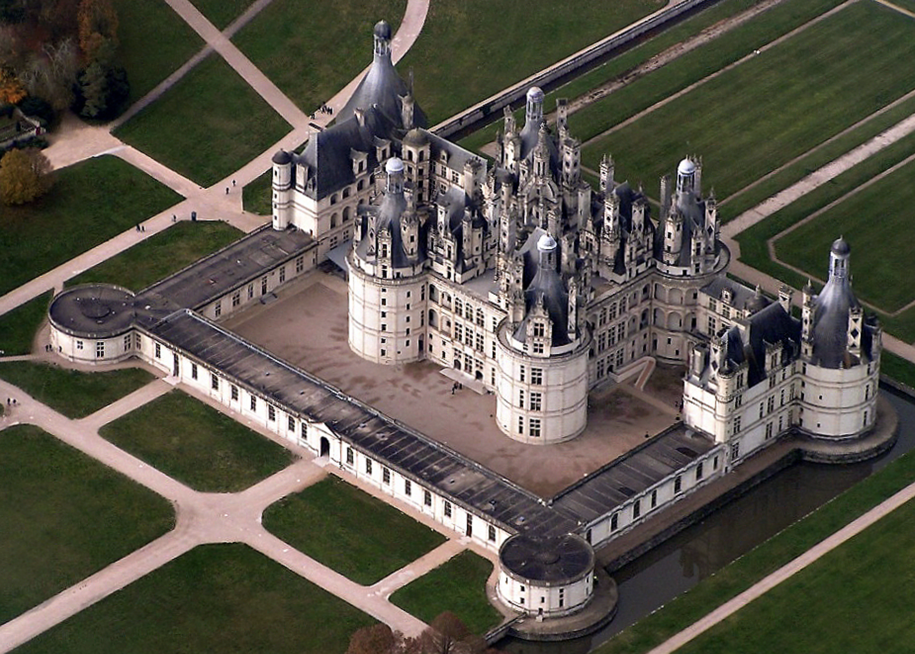 - Chateau de Chambord(1519-1547) – 화려한 탑과 광대한 대칭 레이아웃을 갖춘 르네상스와 고딕 양식이 혼합되어 있습니다.