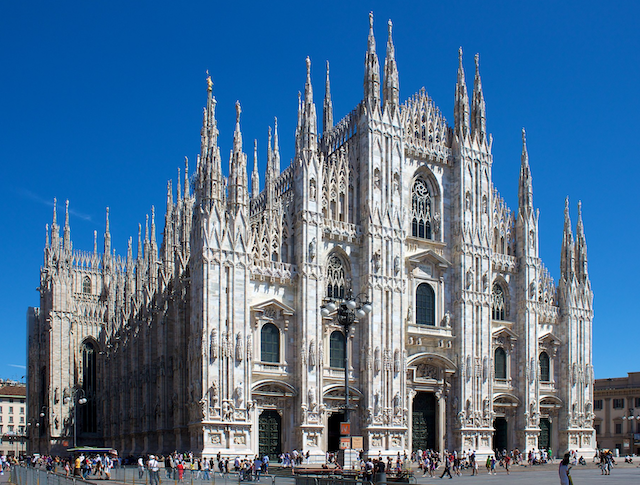 밀라노 대성당 또는 두오모 디 밀라노는 후기 고딕 건축의 놀라운 예입니다. 이 웅장한 성당은 14세기에 착공하여 19세기에 완공되었습니다. 파사드에는 수많은 첨탑을 포함하여 정교한 조각품과 화려한 장식이 전시되어 있습니다. 내부에는 넓은 신도석, 복잡하게 조각된 성가대석, 멋진 스테인드글라스 창문이 있습니다. 대성당의 깎아지른 듯한 크기와 복잡한 디테일은 고딕 양식의 장인 정신을 보여줍니다.